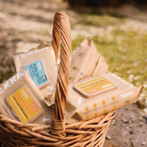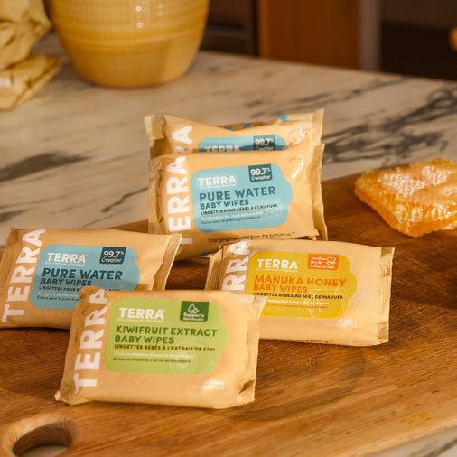 ニュージーランドで作られたTERRAのおしりふきは、自然の恵みを最大限に活かし、プラスチック、化学物質、香料、漂白剤を一切使わない赤ちゃんのお肌と地球にやさしいおしりふきです。