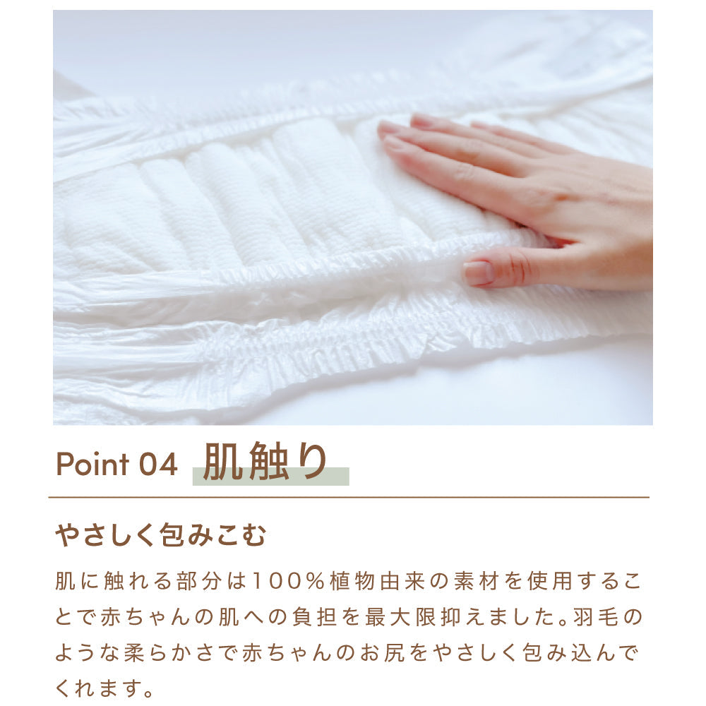 肌に触れる部分は100%植物由来の素材を使用することで赤ちゃんの肌への負担を最大限抑えました。羽毛のような柔らかさで赤ちゃんのお尻をやさしく包み込んでくれます。